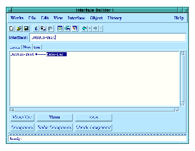 The menus view of the Interface Builder can be used to define a menu system for the current interface. Click the Menus tab to switch to the menus view from any other view in the Interface Builder. The Interface Builder appears as shown in Displaying the menu structure of an interface.
