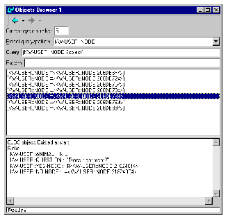 ) clicking on them will display the slot names and values, and information on when the object was created or modified (if debugging is turned on) in the bottom pane. The selected query item may be inspected by choosing
