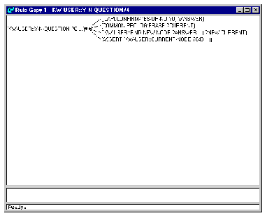 Spy Windows display graphically the actions or subgoals a rule (either forward or backward chaining) will invoke when it fires. A Spy Window may be obtained by choosing Works > Rule > Gspy from the Podium or by choosing Spy > Gspy in the KnowledgeWorks Listener. Spying can be cancelled by closing the window itself or by choosing Spy > NoSpy or Spy > NoSpy All from the KnowledgeWorks Listener.