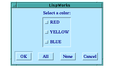 By default, the dialog is created using a list-panel to display the items, but the keyword argument :choice-class can be specified with any choice pane. Thus, for instance, you can present a list of buttons.