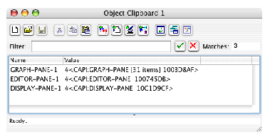 in the LispWorks toolbar. Notice that this creates an Object Clipboard tool if you do not already have one. The Object Clipboard shows the objects you just clipped, and the most recently clipped object appears at the top. It should look like CAPI panes in the Object Clipboard.