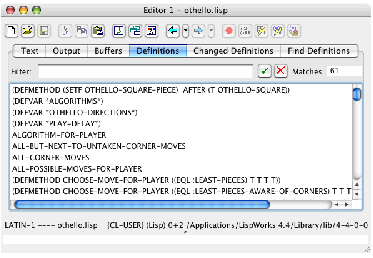 The definitions view lists all the Common Lisp definitions which can be found in the current buffer. Click on the Definitions tab to switch to this view. The Editor appears as shown in Examining Common Lisp definitions in the Editor below.