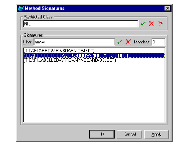 Click Signatures... to display the Method Signatures dialog shown in Method Signatures dialog. This dialog lists the signatures for the methods defined on the current generic function. The signature of a method shows the types of the arguments.