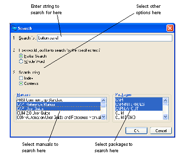 This dialog lets you specify what you want to search for, and which manuals you want to search in.