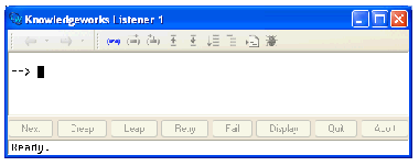 The KnowledgeWorks Listener is obtained by choosing KnowledgeWorks > Listener . This tool is based on the LispWorks Common Prolog Logic Listener (see Common Prolog for further details). Input is taken as being a goal expression to be satisfied unless no predicate of that name and arity (number of arguments) exists in which case it is taken as a Lisp expression. That is, the input may be either