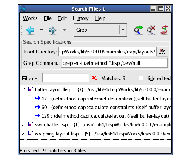 button. This is described in more detail in Entering Search Specifications directly.All kinds of search other than Grep use a LispWorks regular expression (regexp). For details of the syntax of LispWorks regular expressions see "Regular expression searching" in the LispWorks Editor User Guide .