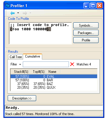 tab shows a graph of functions called by the top level function call that was profiled. Each node represents a function call. The graph edges are labelled according to the proportion of time spent in each function call. For example in The Profiler, of all the time spent in function bar, most was spent in baz and the rest in quux. This allows you to see which branches of the code dominate the total time spent.