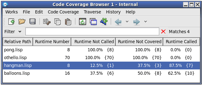 in the Podium. If the LispWorks image has internal code coverage data (that is, some files compiled with code coverage were loaded), the tool initially displays this data. You can load and display saved code coverage data by using