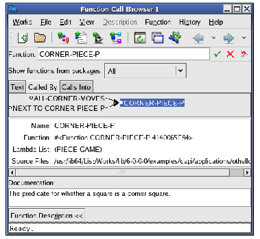 The Function area displays the name of the function being examined, and here you can enter the name of another function to examine. You can use completion to reduce typing. This allows you to select from a list of all functions in the current package whose names begin with the partial input you have entered. Invoke completion by Up, Down or click the