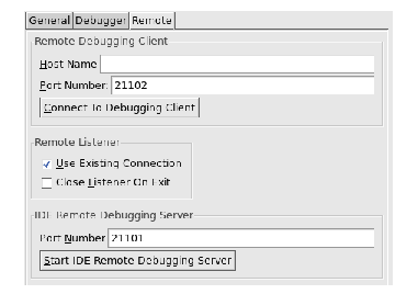 The Preferences dialog Debugger options has a Remote tab that gives you options for remote debugging. To use it, raise the Preferences dialog as described in Setting preferences, select Debugger in the list on the left, and select the Remote tab.