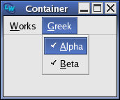 Menu components allow you to specify, via the :interaction keyword, selectable menu items — either as multiple-selection or single-selection items. This is like having radio buttons or check boxes as items in a menu, and is a popular technique among many GUI applications.
