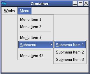 The combination of menu items, menu components and menus can create a hierarchical structure as shown schematically in A schematic example of a menu hierarchy and graphically in An example of a menu hierarchy. This menu has five elements, one of which is itself a menu (with three menu items) and the remainder are menu components and menu items. Items in a menu inherit values from their parent, allowing similar elements to share relevant properties whenever possible.