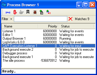 The Process Browser allows you to view and control the processes in the LispWorks multiprocessing model. See the LispWorks® User Guide and Reference Manual for more information about multiprocessing.