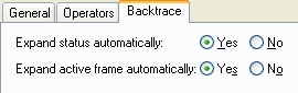 To control the amount of information displayed automatically in the Backtrace area, select the Backtrace tab of the Stepper Preferences: