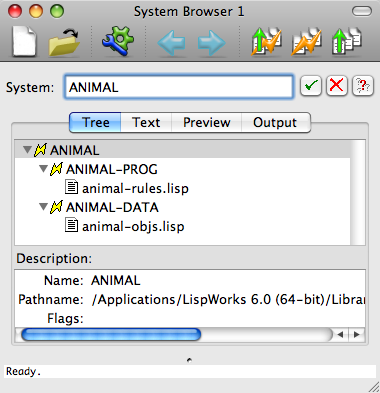 Try this out by finding the KnowledgeWorks Listener and choosing Memory > Clear Objects and Rules. Then enter (load-system "ANIMAL") into the KnowledgeWorks Listener to reload the system animal. Both the files animal-rules and animal-objs are reloaded. Now choose Memory > Clear Objects and reload the animal system again and note how only the file animal-objs is reloaded.