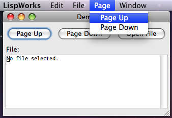 The menu bar definition simply names all the menus that will be on the bar, in the order that they will appear. By default, of course, the environment may add menus of its own to an interface — for example the Window menu in the LispWorks IDE.