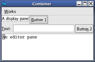 For instance, suppose you want to arrange the elements in your window as shown in A sample layout. The two buttons are shown on the right, with the text input pane and a message on the left. Immediately below this is the editor pane.