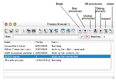 Notice the tool bar buttons in Process browser: these buttons provide the same actions as the Process menu right mouse button popup menu: Break. Stop, Unstop, Kill, Remote Debug, Inspect and Listen.