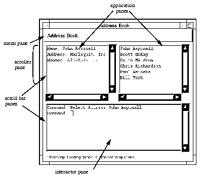 The address book application frame shows a typical pane hierarchy. There are three instances of text panes that have associated scroll bars. For every extended stream pane, or text field, with affiliated scroll bar panes there is an "invisible" parent pane, known as a scroller pane, which does such things as control the layout of the child panes and ensure that its children are given the space they need.
