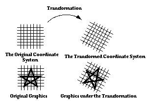 A transformation is an object that describes how one coordinate system is related to another. A graphic function performs its drawing in the current coordinate system of the stream. A new coordinate system is defined by describing its relationship to the old one (the transformation). The drawing can now take place in the new coordinate system. The basic concept of graphic transformations is illustrated in Figure 16.