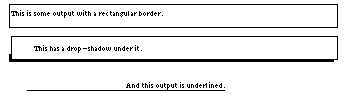 CLIM provides a mechanism for surrounding arbitrary output with some kind of a border. The programmer annotates some output-generating code with an advisory macro that describes the type of border to be drawn. The following code produces the output shown in Figure 34. For example, the following produces three pieces of output, which are surrounded by a rectangle, highlighted with a dropshadow, and underlined, respectively.